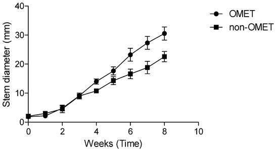 Effect of OMET growth technique on the stem diameter of okra during vegetative stage (n = 12 per treatment).