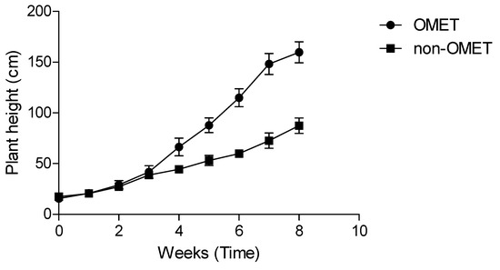 The OMET-grown okra resulted in a gradual increase in the stem diameter from week three, which further showed a two-fold thickness when compared to non-OMET-grown samples in week 8 (Figure 2). The stem diameter is an important agronomic trait for increasing okra’s yield potential [20,21,22]. According to Eshiet and Brisibe, [22] thin stems were not desirable because they were prone to lodging and a lower pod yield. The variation in stem diameter among the treatments might be related to the fact that stems contributed to a higher plant height for the capture of sunlight for the photosynthesis process [23]. The OMET growing technique significantly (p ≤ 0.05) improved the plant height compared to the non-OMET systems, as shown in Figure 3. There was a gradual increase in plant height which was two-fold taller than the non-OMET. Reddy et al. [24] validated how taller plants are crucial for accommodating a greater number of pods on the main stem, and this has a direct effect on the pod yield in okra. The ability of the OMET system to preserve water and nutrients, which resulted in the moderate availability of water and good nutrient solubility and absorption by the plants, was likely the cause of the growing technique’s effectiveness in increasing stem diameter and plant height [25].