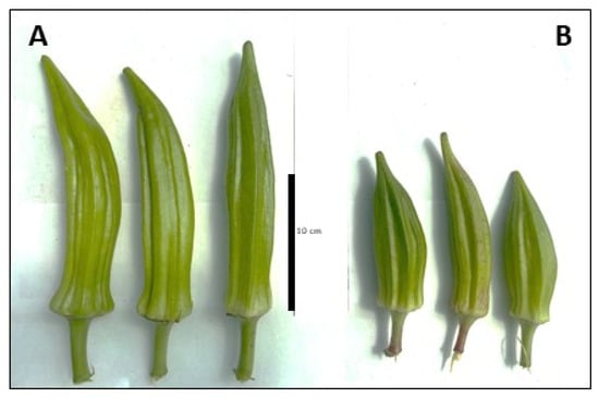 Freshly harvested okra pods (A) OMET and (B) non-OMET grown at day 110 after transplant.
