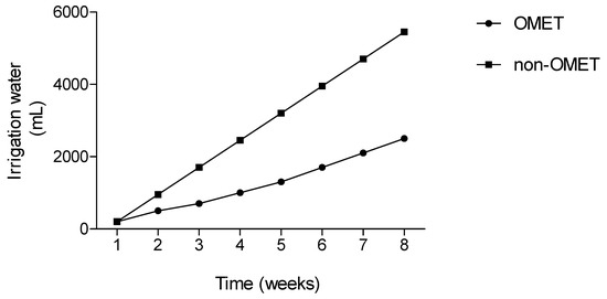 The OMET growing technique significantly affected the amount of irrigation water as more water was used to irrigate the non-OMET-grown okra (p ≤ 0.05). The cumulative irrigation water increased throughout the weeks, as shown in Figure 5 demonstrating that the OMET system improved water retention. Hence, it enhanced growth and yield in the disposal of lower irrigation water. The results may be attributed to the fact that the OMET growing technique was practiced under an enclosed trough which eliminated water seepage, thus advocating for climate-smart agriculture. The results were similar to those reported by Ferreira [2], whereby the OMET growing technique improved the growth and yield of Swiss chard under the disposal of lower irrigation. The top plastic of the OMET system reduced the evaporation rate.