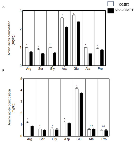 The effect of OMET growth technique significantly (p ≤ 0.05) affected the nutritional levels of okra. A total of 16 amino acid compounds were quantified in okra pods and leaves grown under the OMET and non-OMET growing techniques. The essential amino acid compounds included: Arg, Ser, Gly, Asp, Glu, Ala, and Pro and are illustrated in Figure 6A,B. On the other hand, non-essential amino acids such as His, Thr, Met, Lys, Tyr, Leu, Phe, Asn and Gln were quantified, as shown in Figure 7A,B.