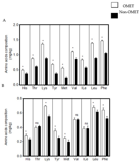 Quantitatively, all essential amino acid compounds were 79% and 74%, higher than non-essential amino acids in okra pods and leaves when grown under OMET and non-OMET conditions, respectively. Glutamine (Glu) and aspartate (Asp) amino acids were the most predominant compounds in both pods and leaves of okra when grown under OMET and non-OMET growing conditions. The Glu contents ranged between 1.00 and 1.11 mg/kg in the pods and between 2.06 and 2.59 mg/kg in the leaves, respectively, in non-OMET to OMET, while Asp content ranged between 3.64 and 4.04 mg/kg and 2.38 and 2.73 mg/kg, respectively. Overall, the trend of the essential amino acids in okra pods grown under the OMET growing technique exhibited higher contents of Arg (1.06 mg/kg), Ser (0.51 mg/kg), Gly (0.52 mg/kg), Asp (1.11 mg/kg) and Glu (4.04 mg/kg), than those grown under a non-OMET growing technique in both okra pods and leaves (Figure 6A,B). However, a non-significant effect between OMET and the non-OMET growing technique was observed for Ala and Pro amino acid compounds in okra pods. All the quantified non-essential amino acids, which included Arg, Ser, Gly, Glu, Ala, Pro and Asp, were higher in OMET-grown leaves samples, as shown in Figure 7A,B. On the other hand, essential amino acids, including His, Lys, Met, Leu, Tyr and Phe, were higher in pods of okra grown under OMET (Figure 7A,B). Yet, Thr (0.38 mg/kg), Val (0.49 mg/kg), and ILe (0.36 mg/kg) were unaffected by the OMET growing technique. Okra leaves grown under the OMET growing technique exhibited higher contents of His, Tyr, Lys, Thr, Met, Val, ILe, Leu and Phe in comparison to non-OMET (Figure 7A,B).