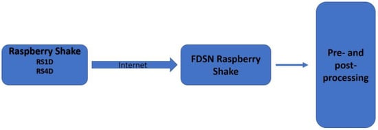 The power supply is 5 V (2.5 A) and the power consumption for an RS unit is estimated at 2.8 W at start-up and 1.5 W during operation. Data are stored on a local SD card (default 8 Gb, but larger cards can be installed). The estimated amount of data per channel is less than 10 Mb per day. The local storage can thus be adapted according to the SD card fitted, the number of sensors, and the selected sampling rate. Time synchronization is based on NTP (Network Time Protocol), but a GPS module can be connected via USB. The Raspberry Pi computer is pre-programmed and contains the SeisComP3 software [23]. SeisComP is a seismological software for interactive data acquisition, processing, distribution, and analysis. It includes many features based on standard protocols (e.g., seedlink) and allows data acquisition, waveform distribution and archiving, and real-time data exchange archiving. Waveforms are saved in miniSEED format. Using the SeisComP software package, data from seismometers are accessed via FDSN (International Federation of Digital Seismograph Networks [24]) web services. A data-flow transmission scheme is presented in Figure 2.