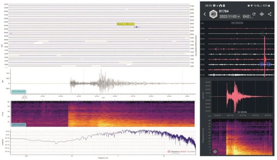 These records are generated with Python code notebooks from the JupyterHub created specifically for ROEDUSEIS Network data users [22]. All seismograms show P- and S-waves, even though the recordings are from the seismometers’ vertical channel (EHZ). For inexperienced users who wish to learn about earthquakes recorded by citizen science networks, data from Raspberry Shake seismometers can be viewed online using ShakeNet Web and Desktop Apps [28], available for any devices connected to the internet. To use these applications, creating a user account is unnecessary, and the working steps are very intuitive, generally involving searching for the seismometer code and the date of the month for which you want to view the data. Figure 6 below shows the outputs (helicorder, waveforms, power and frequency spectra) for the 3 November earthquake recorded by the R1784 seismometer deployed in the northern part of Bucharest using the Raspberry Shake online applications: ShakeNet Web and Desktop Apps (left) [28] and ShakeNet Mobile Apps for Android and iOS (right) [29].