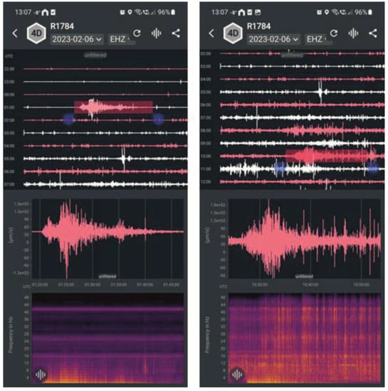 M7.8 (left) and M7.5 (right) earthquakes occurred in Turkey on 6 February 2023, recorded by the R1784 RS seismograph and displayed with ShakeNet Mobile Apps [29].