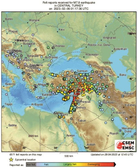 European-Mediterranean Seismological Centre questionnaire report map of the M7.8 earthquake from Turkey [37].