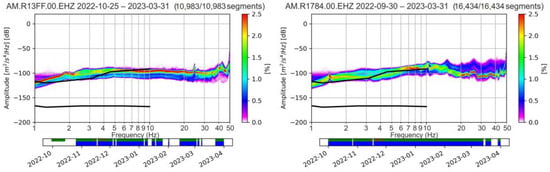 We performed an ASN analysis to investigate noise behavior at the BRSSN citizen seismometers in the high-frequency domain (5–40 Hz). To estimate background noise levels at the stations, we computed the Probability Density Functions (PDFs) following the methodology described by McNamara and Buland (2004) [45]. The process involves calculating the Power Spectral Density (PSD) for each time segment and channel. Subsequently, the individual PSDs are collected to create frequency distributions, which are constructed by binning periods in 1/8 octave intervals and power in 1 dB intervals. Each frequency distribution bin is then normalized using the total number of PSDs, creating a PDF for that bin. The PDFs are useful for tracking and assessing seismic station performance [45,46,47,48]. Figure 10 shows the PDFs computed for two Raspberry Shake seismometers for almost six months of continuous data recordings at R13FF and R1784. To facilitate the understanding of the results, the PDFs are displayed combined with two globally acknowledged standard models, Peterson’s (1993) [49] low and high new noise models (NLNM and NHNM). It is observed that the background seismic noise level depicted by the high probability region lies closely above NHNM for the entire high-frequency band (1–40 Hz). This implies a high noise level at the stations, in agreement with the various anthropogenic noise sources that affect the seismic records.