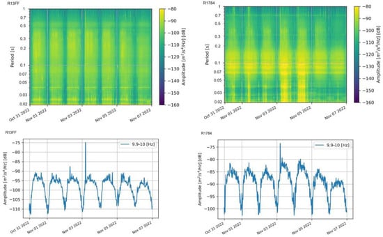 The spectrograms and the noise amplitude–time plots for two seismometers, one installed on the ground floor of a residential building in the Bucharest western area (R13FF) and the other in French School Anna de Noailles located in the Bucharest northern area (R1784), are presented in Figure 11. The spectrograms and the amplitude–time plots are computed for a time window of seven days (31 October–6 November 2022), which includes the ML = 5.3 Vrancea earthquake that occurred on 3 November. They both show an increase in seismic noise power during the day in the 0.02–0.5 s period range (2–50 Hz) and a decrease during the night. The amplitude–time plot and spectrogram for the R1784 seismometer also show a clear variation in noise levels between weekdays and weekends. The students who attend courses are responsible for the increased noise levels observed from Monday through Friday. The noise power of the 3 November 2022 earthquake can be seen in the 0.1–1 s period region, which is emphasized with a yellow line. This pattern is apparent in all seismometers used in this study and is plainly seen in the amplitude–time plots as well.