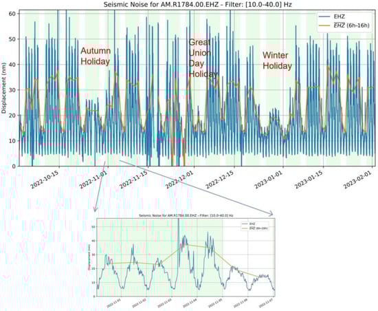 Long-term changes in seismic noise at the R1784 seismometer. The zoomed area highlights the 31 October–6 November 2022 week. The peak on 3 November corresponds to the ML = 5.3 Vrancea earthquake.