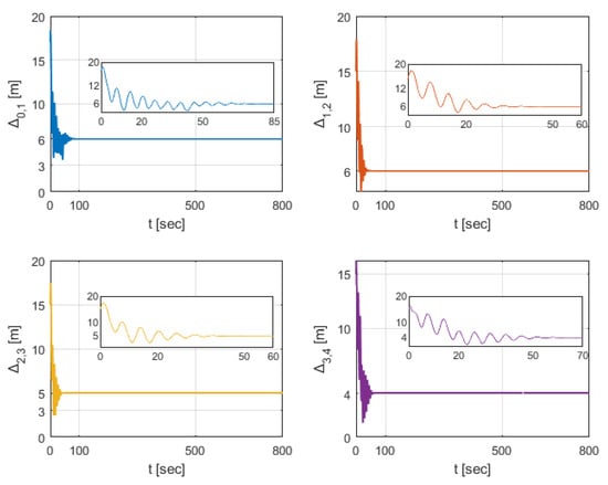 20] the authors conclude that for all vehicles in the platoon, the optimal distance is 6m, in that simulation, we slightly changed these values for the third and the fourth vehicle in order to investigate whether the algorithm could correctly track and maintain different optimal distances. Furthermore, the initial distances were intentionally selected far from these values to demonstrate the robustness and efficiency of the controllers. Simulation results are shown in the figures below.