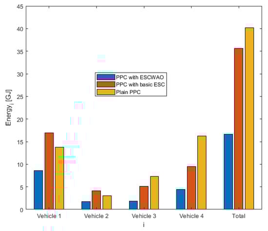 . Employing the same system as before, we compare the final energy values for the plain PPC (fixed inter-vehicular distances), the proposed PPC with ESCWAO, and the basic ESC with PPC, as designed in