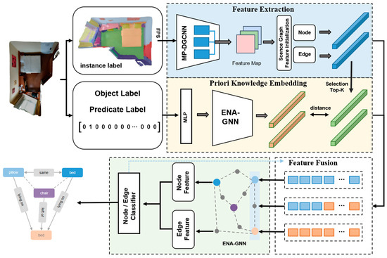 Scene understanding can simulate the human cognitive process of the natural world by perceptually recognizing various contextual information in a scene [1]. From autonomous robot navigation, autonomous driving and SLAM to AR/VR and a scene’s layout for interior design and architecture, research on scene understanding and perception is expanding in various fields [2,3]. Many studies based on 3D scene understanding have emerged, such as 3D shape classification, semantic segmentation, object detection, instance segmentation and scene layout [4,5,6]. In practical tasks, it is no longer just satisfied with obtaining simple 3D scene semantic information, such as the object and attribute information of the scene, but it also needs to obtain richer semantic relationships between objects.