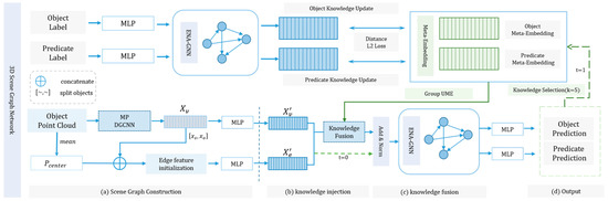 The 3D scene graph prediction network. (a) First, enter the point cloud into the network. After MP-DGCNN extracts the initial point cloud geometric feature, , splice it with the centroid of the object, and after initialization of the node and edge features, obtain the features and . (b) Knowledge learning network stage: acquire a priori knowledge in the form of embedding vectors by learning the labels of categories in the scene and then add category weights to obtain unbiased meta-embedding (UME). (c) Knowledge fusion stage: input and , the first inference after ENA-GNN with the classifier, to obtain the initially predicted likelihood vector from the prediction results selected from the top five categories of UME and fuse them to re-run the inference process. (d) After the prediction, the scene graph triad is obtained, including objects and predicate relations.