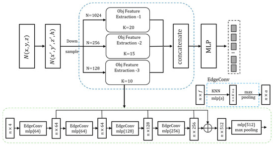 Due to the specificity of the scene graph structure, which requires encoding the features of each node and edge from the point cloud, EdgeConv using DGCNN is chosen as the core part of the feature extraction network [5]. Unlike the previous approach [11,14] that only considers using PointNet [4] for the geometric feature extraction of point clouds, EdgeConv serves as a high-performance point cloud classification model using graph theory [5]. Moreover, it can learn the point cloud’s contextual features and aggregate the neighboring information in the high-dimensional feature space. As shown in Figure 3, we added a multi-scale aggregation mechanism to the original network architecture [30,31] used to obtain the multi-scale point cloud features and thus design a new feature extraction network architecture, MP-DGCNN.