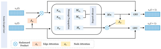 Eventually, a gated recurrent unit (GRU) [37] is used to update the hidden state to retain the initial information. In order to calculate all nodes in each layer and all directed edges of the potential representations and of the message-passing process, the message propagation of the nodes and edges is as follows: