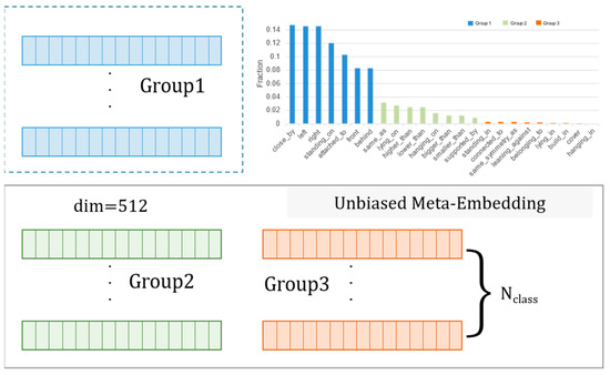 However, the learned meta-embeddings as a priori knowledge are unclear and may interfere with the network model category prediction [14]. Based on the idea of unbiased training, an unbiased meta-embedding (UME) coding fusion approach is proposed to group the predicate relation categories in order of sample proportion. As seen in Figure 6, the categories are divided into three groups, and the detailed grouping strategy is referred to in Section 4.1.