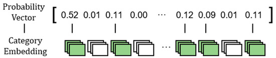 The knowledge fusion process, divided into multiple iterative loop processes, can be carried out several times using the knowledge fusion process. Firstly, for the knowledge selection, the object and predicate category probability vectors can be obtained after the initial prediction of the scene graph. The corresponding features of the predicted category with a top-five likelihood are selected for fusion. The category selection is carried out for the meta-embedding encoding, as seen in Figure 7, and the category’s prior feature vector after the screening is obtained. The selected prior embedding UME is fused with the extracted point features. Since they are in different feature spaces, they are transformed into approximate feature spaces using two layers of encoded feed-forward neural networks, f (∙) and g (∙) [14]:
