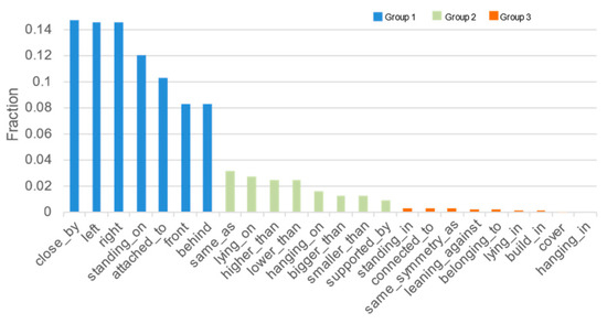 The grouping results are shown in Figure 8, where different object entities and predicate categories are statistically sorted according to the number of samples. The grouping principle is the extreme difference in the number of samples of different categories within the group that does not exceed 4 times. For the weights in the training process allocation, this paper uses a weighting approach, and for each group of categories, a weight range is set and calculated as follows: