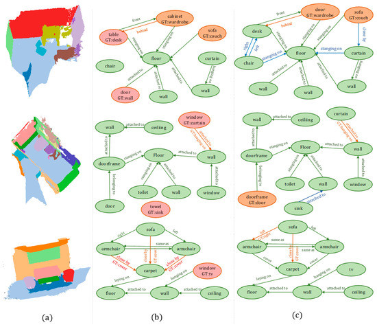 Dataset: The 3DSSG, a publicly available large indoor 3D semantic scene graph dataset, is based on the realistic 3D scan dataset, 3Rscan [11,12]. The dataset mainly contains support, proximity and comparison relationships between the entity objects in indoor scenes. During the training process, larger scenes are partitioned, with an average of 9 objects per scene, 160 classes of entity objects and 27 classes of relationships between objects (including “none”). The training file is divided so that there are 3582 scenes in the training set and 548 in the validation set.