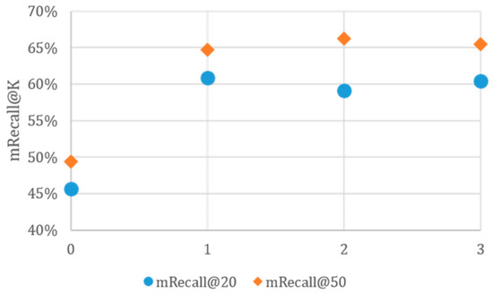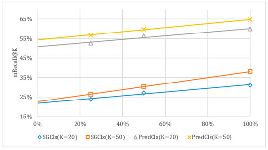 Since the prior embedding vectors from the ground-truth labels’ learning are used, our ENA-GNN network can better fuse the prior embedding vector features with the extracted initialized point features. Figure 11 shows the experimental results using different proportions of the training set samples. We can obtain similar experimental results to the full sample participation using about half of the training samples. Since, for the PredCls task, the ground-truth labels of the objects are known, acceptable predicate classification results can be obtained with a tiny number of samples involved in the training.