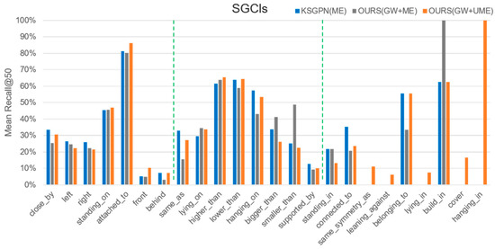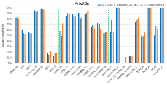 Table 2 shows the results of the predicate classification task. In the predicate classification task, the category for the object is known information; therefore, improving the prediction effect is mainly related to the relational inference network and the use of prior knowledge. The effect of the feature extraction by MP-DGCNN is weakened in this task. However, the relational inference network, ENA-GNN, used in our method, enhances the adaptive capability of message-passing in graph neural network inference by taking into account the cross-attention of the nodes and edges; at the same time, the loss function is weighted by group re-weighting (GW) and incorporates the UME a priori category knowledge coding. The experimental results show that the method proposed in this paper still significantly improved when compared with other baseline models, including the latest methods. The prediction results improved by about 3.4% and 5.9% under the R@50 and ngR@50 metrics, respectively, and about 1.5% under the mR@50 metric by about 1.9%. The results improved by about 7.6% and 10.3% under the R@20 and ngR@20 metrics, respectively, and by about 7.6% under mR@20.