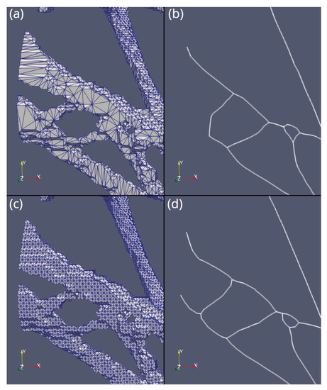 The graph representing the skeletonized mesh is processed to obtain the initial solution. This process has a single configuration variable: the minimum path length. In the first step of the process, all paths between the graph’s loose nodes (with a single edge) or intersection nodes (with more than two edges) are calculated. Those paths are either replaced with single edges, or, if the path curvature is high enough, with a series of edges approximating the path. A biomimetic approach used as an input of the recognition algorithm yields a porous and unstable structure in areas where the mesh resolution is insufficient to represent the fine microstructure present in the analytical solution, as shown in Figure 5. This phenomenon justifies filtering out such porous structures in the initial solution. Hence, all edges shorter than the given minimum path length are collapsed. This also enables some degree of solution resolution control—a high value of minimum path length simplifies topology by collapsing the fine details. Sample data illustrating the whole process are illustrated in Figure 6. Finally, the graph obtained this way is converted into the initial solution by assigning the default radius to each graph edge.