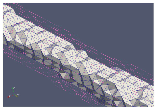 The evolutionary algorithm requires the definition of the Fitness Function to calculate a score for each candidate and select the best one. The Fitness Function must be quick to compute and at the same time accurate to enable visiting many candidates in a short time. The optimal solution of a feature recognition algorithm is a set of features that completely fill the volume of input data and do not exceed it. Scoring based on volume requires the time-consuming operation of intersecting the input mesh with the scored solution to find differences. The optimization of this approach uses a mesh discretized using a slice-based approach and comparing discrete sets of points. This approach has complexity, so a more efficient but less precise approach was used. As the algorithm operates on the surface, the not-volumetric, mesh, surface-based approach was also used for the Fitness Function. Two sets of points are calculated: control points and guide points. Control points are points on a mesh surface that are used to determine how close a solution’s surface is to the input surface. A set of guide points is obtained by the morphology dilation of the input mesh. The size of the dilation is an input parameter of the algorithm. Details of the mesh surrounded by the guide points are shown in Figure 7.