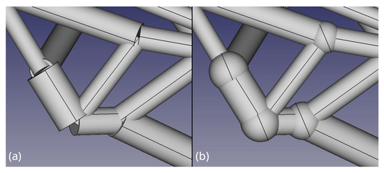 Additionally, the export script creates spheres at each node to ensure a proper connection between cylinders, as shown in Figure 8. The radius of each sphere is 110% of the biggest radius of the element connected to the node. The extra margin was added to avoid numeric errors reported by CAD software when fusing elements with a similar radius to produce the final mesh. Note that those spheres are only added in the final step and are not part of the ’main’ geometry. Hence, to simplify the calculation of the Fitness Function, it was decided to ignore those extra parts during the refinement step, despite the fact that they contribute to the overall volume and mass of the model.