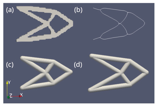 Structural optimization is used as one of many steps in the Additive Manufacturing design workflow, which starts with product planning and ends at product validation [7]. The optimized part is further processed in CAD software to post-process it and prepare for manufacturing [8]. There are a lot of techniques for the post-processing of 2D structural optimization results, mostly based on image recognition techniques such as Hough transform [9], morphological processing [10] or features mapping [11,12]. The selection of post-processing techniques in a 3D domain, due to the greatly increased number of topological complexities [13], is limited. Techniques are based on removing material from the initial full domain, by matching pre-defined 2D shape templates [14] or by matching machining features using dedicated algorithms [15] or machine learning [16,17]. The skeletonization of structural optimization results enables tracing models with cubic B-splines, either as a manual, computer-aided process [18] or as a fully automated process [19]. Approaches gaining popularity with Additive Manufacturing [20] are based on mesh processing such as smoothing [21] without converting the results to a CAD model or converting the results to a CAD model as a watertight shell [22].