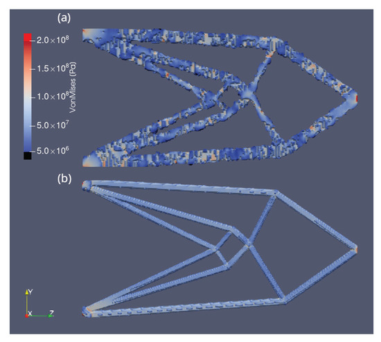Comparison of von Mises stress for structural optimization output (a) and object reconstructed in CAD (b).