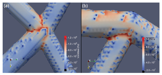 The reconstructed object exhibits both a higher overall mass and worse material properties. Although, for Load Case 1, the parametric model exhibits a lower mean stress and comparable deflection values. For Load Case 2 and Load Case 3, all analyzed measures exceed acceptable values. Details with areas exceeding the allowed surface von Mises stress are visible in Figure 23. Analysis shows that a cylindrical structural element, used to build the parametric model, is insufficient to represent the complex structure of the element optimized using the biomimetic approach. The surface stress exceeds the material’s yield strengths in a few different distinct cases: the attachment points to the boundary areas are insufficient, the connection between elements are too weak and the cylinders exhibit poor behavior under bending moments (Figure 24). On the other hand all those problems can be solved manually by engineers in CAD software based on the provided structural analysis results.