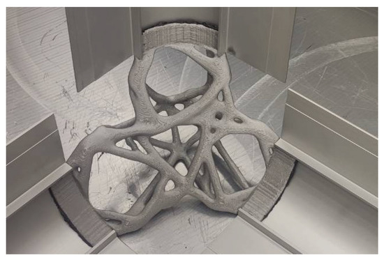 Photograph of one of the prototypes of the optimized box corner. This particular element has been processed with surface smoothing [21] and manufactured using FDM technology. Aluminum box edges are attached to the optimized object’s edges—areas excluded from optimization.