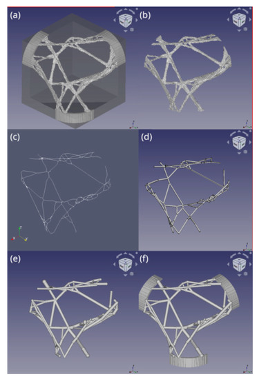 Initial mesh and refinement progress. Mesh in (a) is an STL file; (c–f) are CAD objects; (a) initial mesh; (b) output of skeletonization algorithm; (c) initial solution—input for evolutionary algorithm; (d) solution after 100 steps; (e) solution after 250 steps; (f) final solution after 564 steps.