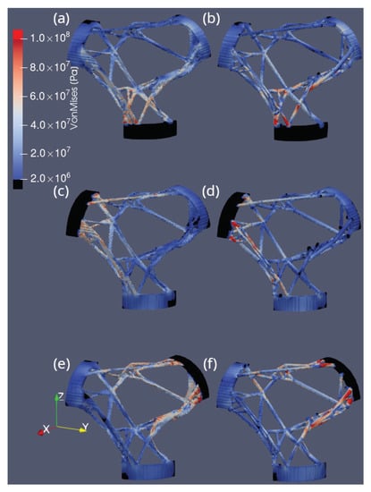 (a,c,e) von Mises stress on a surface calculated for the structural optimization output. (b,d,f) von Mises stress on a surface calculated for the mesh reconstructed in CAD; (a,b) Load Case 1. (c,d) Load Case 2. (e,f) Load Case 3.