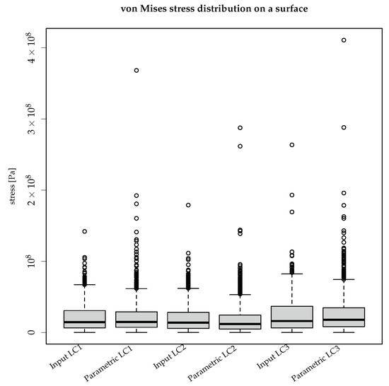 Boxplot showing von Mises stress distribution on a surface, calculated for both the feature recognition input mesh and the output parametric model, for each of three load cases. For each load case, the parametric model exhibits comparable mean stress values and the third quartile is lower, indicating better mechanical properties. On the other hand, the parametric model contains multiple outliers with high stress concentration. In practice, those areas determine the overall stiffness of the final design and are undesirable.