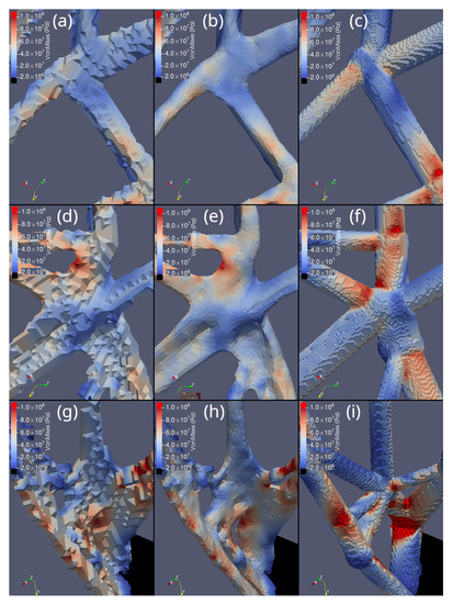 Comparison of structural analysis results between the structural optimization output with the reconstructed parametric model. (a,d,g) Structural optimization output. (b,e,h) Structural optimization output processed with surface smoothing for better visibility of the details. (c,f,i) Reconstructed parametric model. Three different details of the model are presented. Parts with the von Mises surface stress exceeded in the reconstructed model, compared to structural optimization output, resemble tapered cylinders. An approximation with cylinders is insufficient.