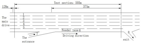 The detection area comprises eight lanes, of which lane 1 is the high-occupancy vehicle lane, lane 6 is the distribution lane, lane 7 is the entry ramp, lane 8 is the exit ramp, and lanes 1–6 are unidirectional lanes with a length of about 503 m. The driving direction is from south to north, the average flow rate is 7124 veh/h, and the average speed is 8.32 m/s. This study selected the data from the congestion period, which contains a large number of trajectory data of car-following and lane-changing behavior and well meets the data requirements.