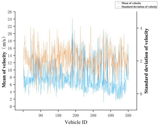 The average and standard deviation of the speed can reflect the quality of a driver’s driving behavior during driving. The higher the average speed of the vehicle is, the greater the possibility of overspeed during driving will be. A large standard deviation of speed indicates that the speed varies greatly. Through the analysis of the data in the dataset, the mean and standard deviation of the vehicle speed were obtained (as shown in Figure 2).