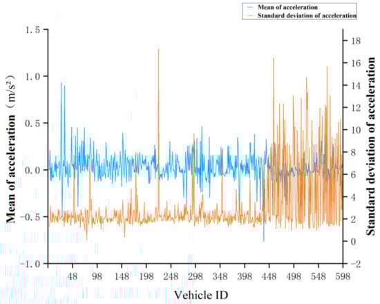 The acceleration can reflect the amplitude of the driving speed adjustment during driving, further reflecting the driving stability of vehicles. Therefore, an overall analysis was conducted on the acceleration data in the dataset in this study, selecting the mean and standard deviation of the acceleration for analysis, as shown in Figure 3.