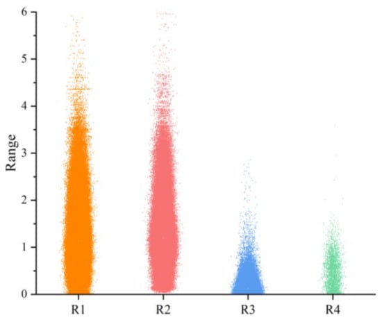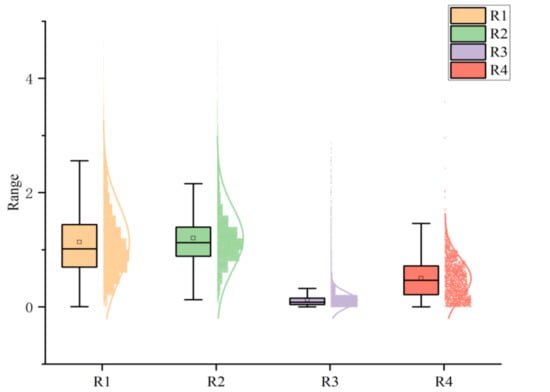 Figure 4 shows the distribution of the evaluation results of the four driving behavior risk indicators. As shown in Figure 4, the values of each indicator are concentrated in the lower numerical range, and only a small part of the data are concentrated in the larger numerical range. The upper boundary of each indicator was considered as the risk threshold, which means that the risk of driving behavior was greater at the distribution points in the area with larger values.