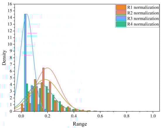 The driving behavior risk measurement model also represents the transition from conservative to dangerous behaviors as the value of the indicator increases. Before the driving behavior risk indicator is weighted, each indicator must be normalized to avoid the influence of the unit dimension among different driving behavior risk indicators. The min–max standardization method selected in this study could eliminate the differences among the indicators []. The formula is shown in Equation (10)