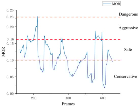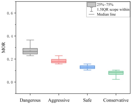 Figure 8 shows the cluster results of the risk measurement for four types of driving behaviors. The range of the MOR value is [0, 0.47], which includes four evaluation results: dangerous, aggressive, safe, and conservative. Among them, the dangerous type was characterized by the largest range, but the sample size was small, only accounting for 5.40% of the entire sample. This showed that the driving behavior risk measurement model will sensitively judge a behavior as dangerous when the vehicle shows a dangerous driving behavior. According to the clustering results of the driving behavior risk measurement, the driving behavior of each driver at different times during driving can be analyzed, that is, the same driver may have different driving behaviors under various conditions, as shown in Figure 9.
