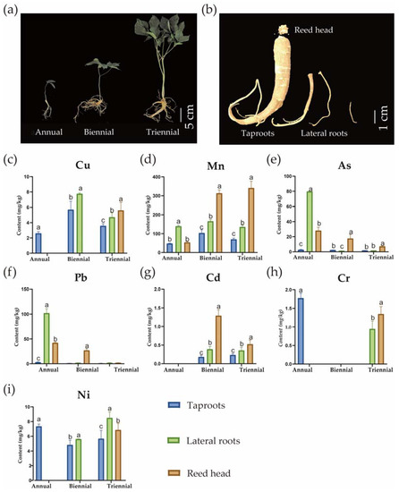 Figure 1. Analysis of heavy metal content in various parts and growth stages of American ginseng. (a) The image of annual, biennial, and triennial American ginseng plants; (b,c) The image of the whole and dissected root of triennial American ginseng; (di) the content of Cu, Mn, As, Pb, Cd, Cr, and Ni in the taproots, lateral roots, and reed head of annual, biennial, and triennial American ginseng. Various letters above the bars in a single bar graph indicate significant differences among the treatments at p < 0.05.