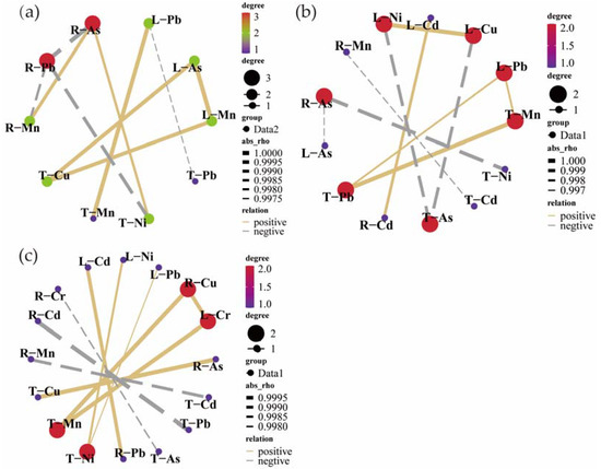 Figure 2. Correlation among the content of heavy metals in various parts of annual (a), biennial (b), and triennial (c) American ginseng. T represents taproots, L represents lateral roots, and R represents reed head. The yellow solid lines or blue dotted lines represent positive or negative correlation, respectively. The size of soil circle and color range represent the number of related objects, and thickness of the line represents the strength of the correlation.