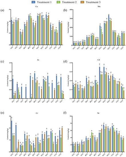 Figure 3. Content of Cu (a), Mn (b), As (c), Cd (d), Cr (e), and Ni (f) after soaking American ginseng for 0 min (treatment 1), 30 min (treatment 2), or 3 h (treatment 3). Various letters above the bars in a single bar graph indicate significant differences among the treatments at p < 0.05.