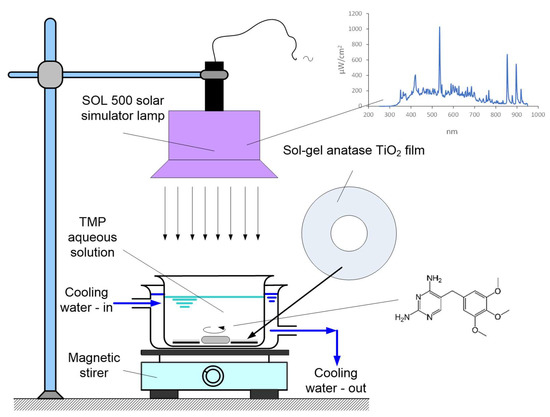 A simulated solar radiation lamp (model SOL 500 by Dr. Hönle AG, Gilching, Germany) was used as the source of radiation for both photolytic and photocatalytic experiments. The irradiation spectrum of the lamp is given in Figure S1 in the Supplementary Materials.