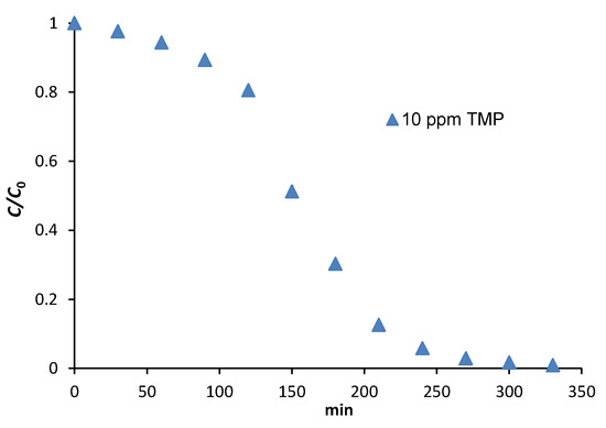 The photolytic degradation process of TMP is presented in Figure 2. The graph indicates that the complete degradation of TMP requires at least 5 h of irradiation with simulated solar radiation. However, when the photocatalytic film on the bottom of the reactor is introduced, the time required for complete degradation is reduced to fewer than 3 h, as shown in Figure 3.