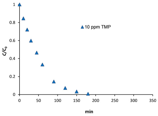 The photocatalytic degradation of TMP without pH adjustment resulted in a TOC reduction of 4.59 mg/L, with a starting TOC value of TOC0 = 5.85 mg/L and a final value of TOC180 = 1.26 mg/L after three hours.