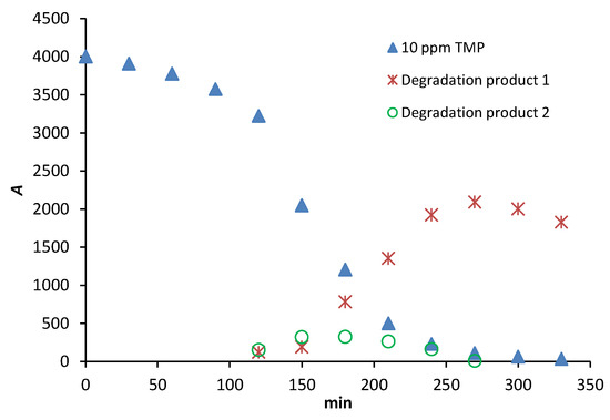 The formation and degradation of DP1 and DP2 (Figure 4 and Figure S2 in the Supplementary Material) was monitored through the increase/decrease of the chromatographic peak areas (A), which are proportional to their concentrations. Because there are no DP1 and DP2 standards it was not possible to convert the chromatographic peak areas into the corresponding concentrations.