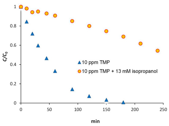 According to the data shown in Figure 5, Figure 6 and Figure 7, it can be concluded that it seems the main mechanisms of the TMP degradation are the acting of ●OH radicals and oxidizing positive holes (h+). The process of their generation on the photocatalytic film that consists of anatase TiO2 is irradiation with wavelengths below 387.5 nm (UV-A region), i.e., with energy higher than 3.20 eV (bandgap of the anatase TiO2). Solar radiation can be used for this process, although the efficiency in this case is relatively low—only approximately 3–5% of the global solar radiation consists of the wavelengths in the UV-A region, but it is still enough for use for the oxidation of the organic matter in water. We conducted experiments simulating the most favorable situation, which is solar radiation at the time of the day when it is most intense—at approximately noon. In other parts of the day, the radiation is less intense and the organic matter degradation would be less efficient.
